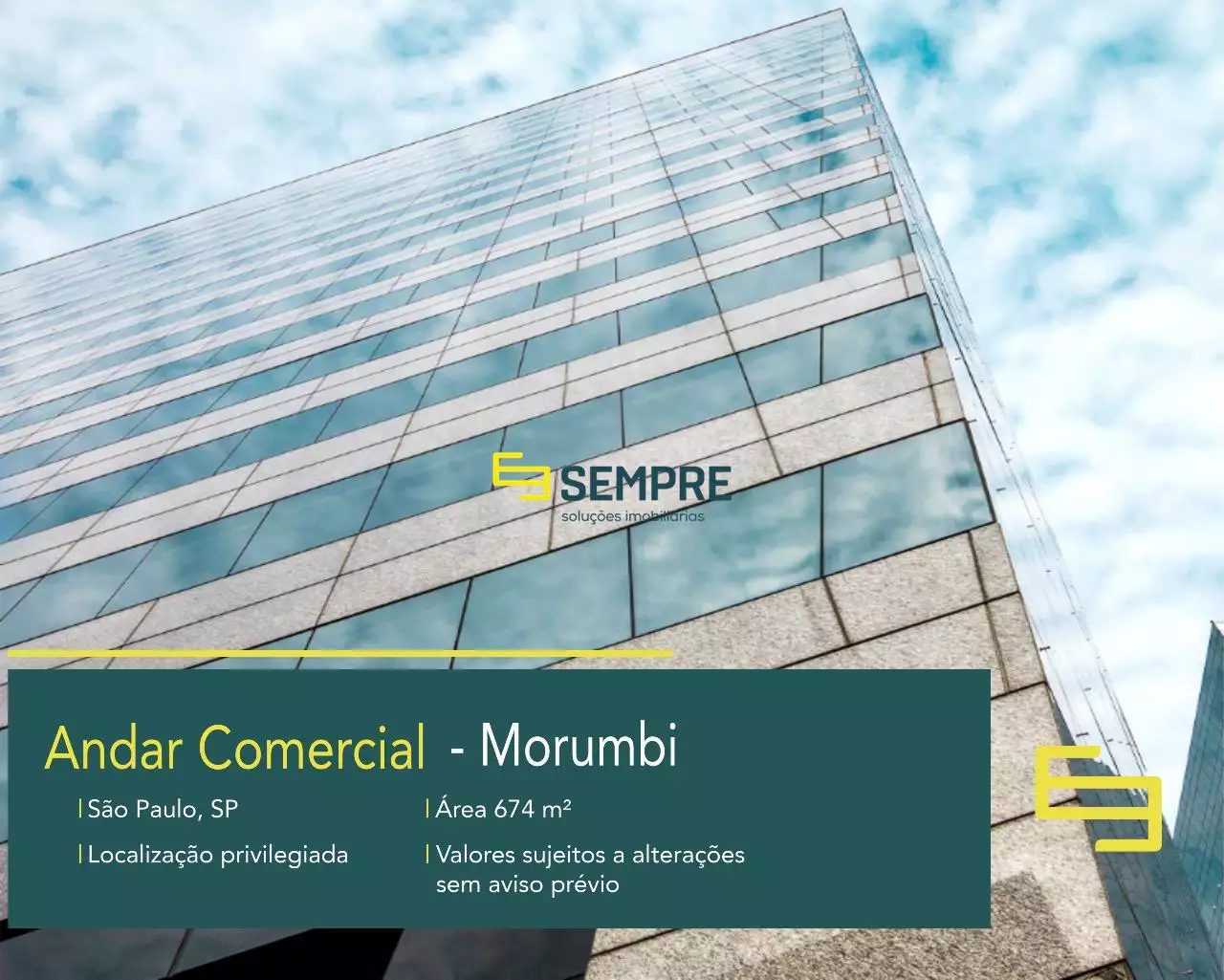Aluguel de andar comercial na cidade de São Paulo com 674 m², com uma fachada em pele de vidro reflexivo. O edifício é a definição de elegância e modernidade.