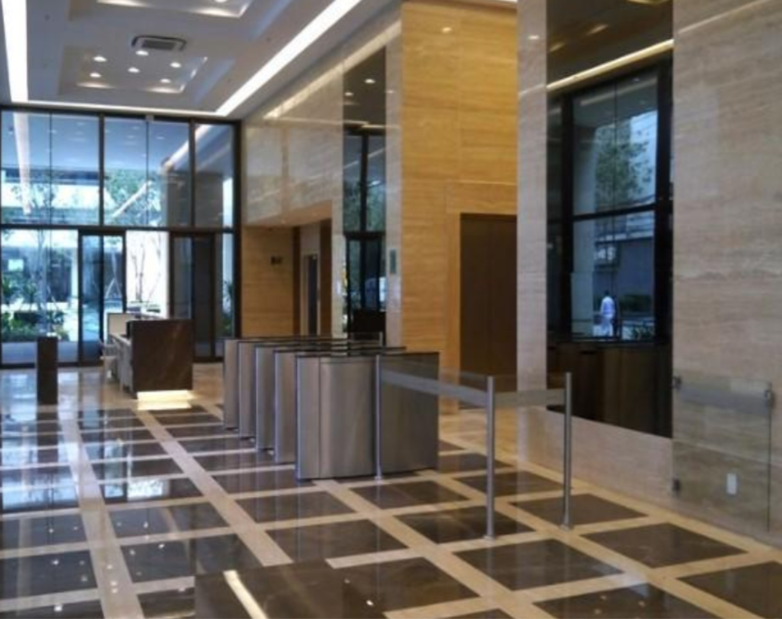 - Hall decorado e ambiente corporativo moderno.